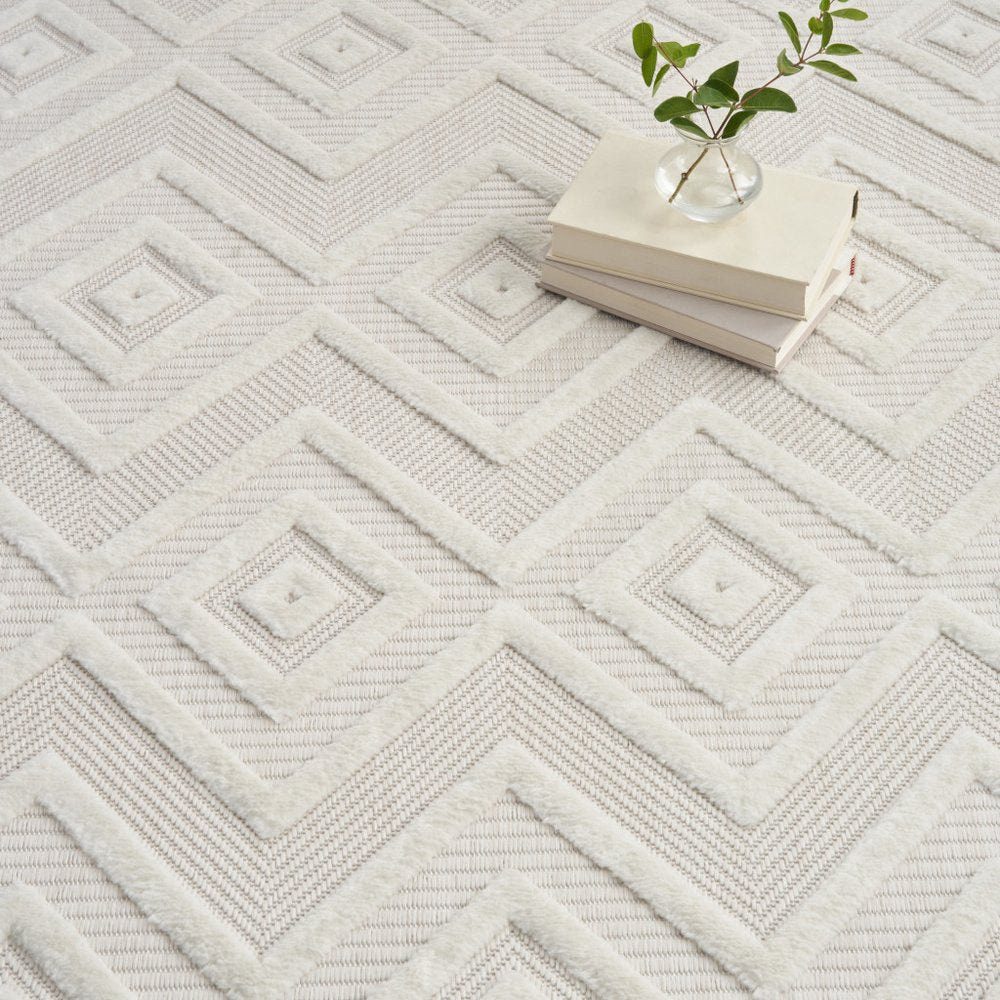 Add great coloration and comfortable texture to your space with this 10-foot x 14-foot ivory and white geometric indoor outdoor area rug. This rectangle shaped rug features a geometric design that will work well both indoors or out. A classic shape marries with good looking design for your living room, hall, bedroom, porch, patio, or poolside. Makes a great way to dress up your patio, porch, or poolside, but also works well as a durable and easy to maintain option in the kitchen, family room, or mudroom. 120-inch h x 168-inch w x 0.3-inch d.