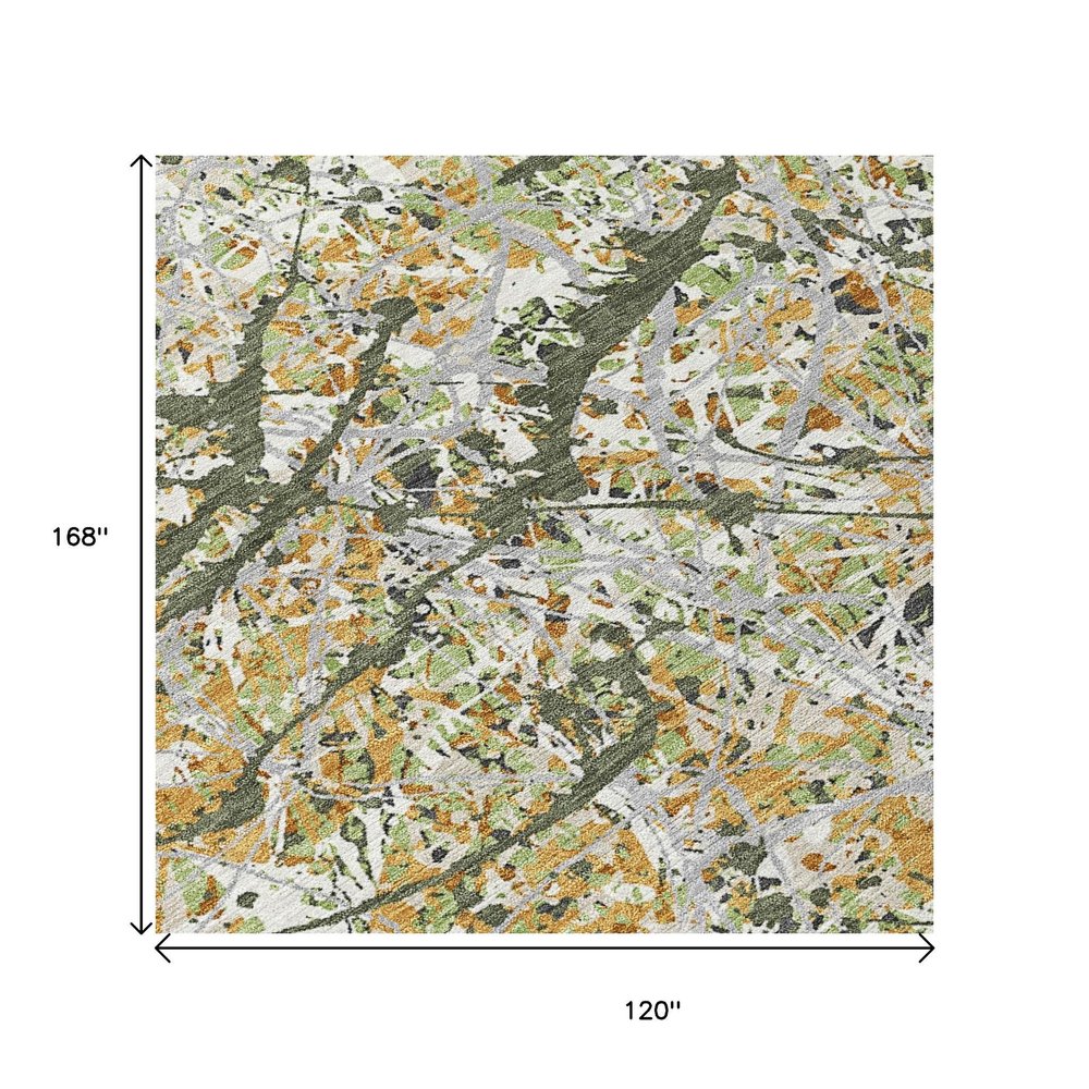 10' X 14' Olive Green Gold And Ivory Abstract Washable Indoor Outdoor Area Rug
