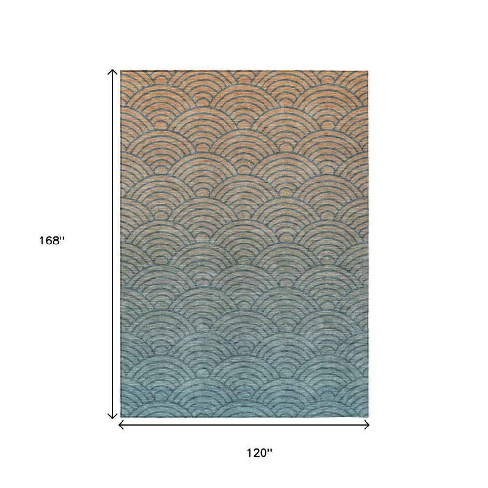 Add some artistry to your room with this 10-foot x 14-foot teal blue and orange geometric washable indoor outdoor area rug. This rectangle shaped rug features a geometric design that will work well both indoors or out. A classic shape marries with good looking design for your living room, hall, bedroom, porch, patio, or poolside. Ideal for outdoor spaces or high traffic areas with kids and pets, this rug is made from heavy duty polyester that is stain resistant to help repel water, dirt, and stains. Makes a great way to dress up your patio, porch, or poolside, but also works well as a durable and easy to maintain option in the kitchen, family room, or mudroom. 120.00-inch h x 168.00-inch w x 0.19-inch d.