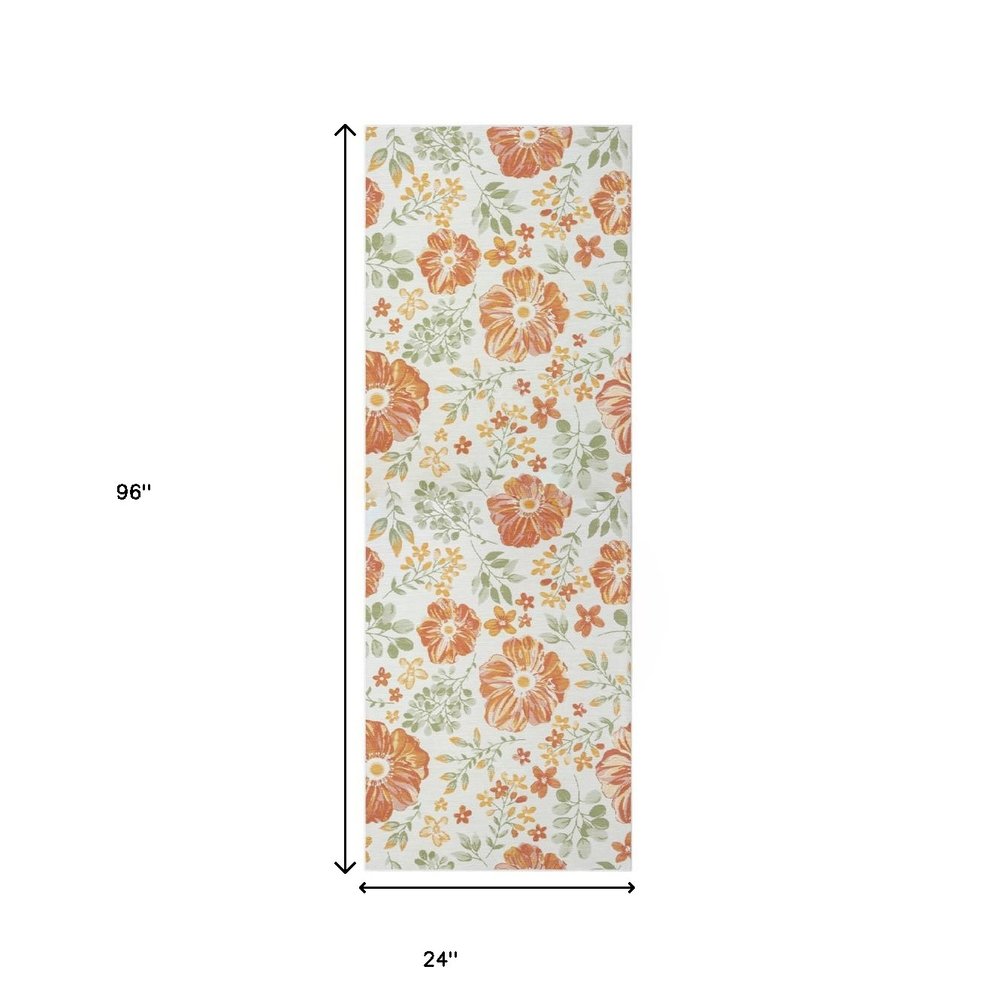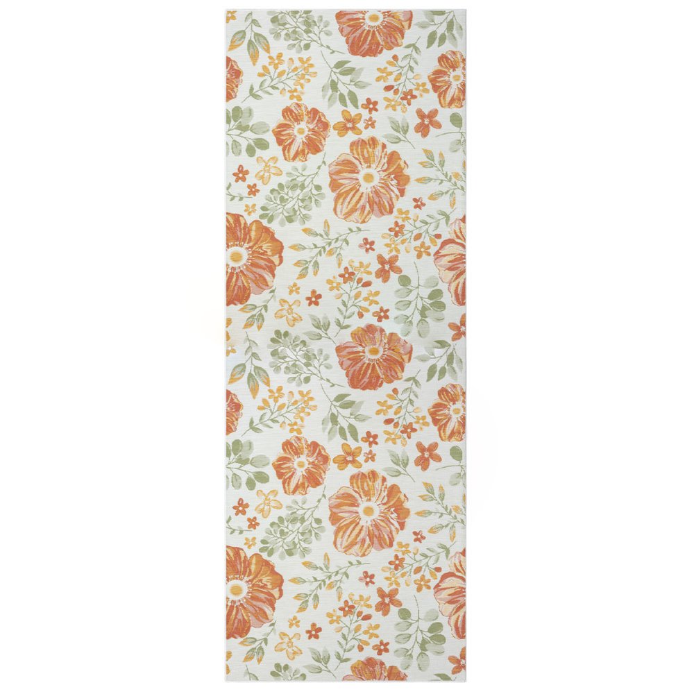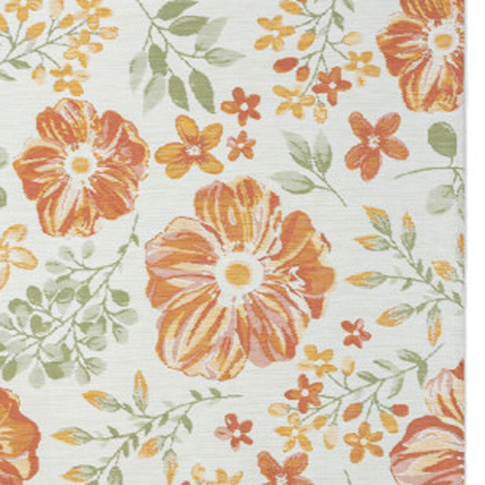 Add great coloration and comfortable texture to your space with this 2-foot x 8-foot ivory green and orange floral stain resistant indoor outdoor runner rug. This runner shaped rug features a floral design in ivory green and orange to give it visual interest. A classic shape marries with good looking design for your space ideal for spaces with kids and pets, this rug is stain resistant to help repel stains and spilled liquids. Area rugs help to give warmth and sense of home to your space. 24-inch H x 96-inch W x 0.15-inch D