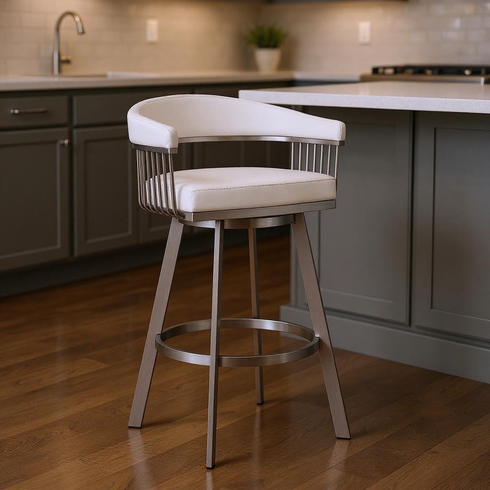 25" White And Silver Iron Swivel Low Back Counter Height Bar Chair
