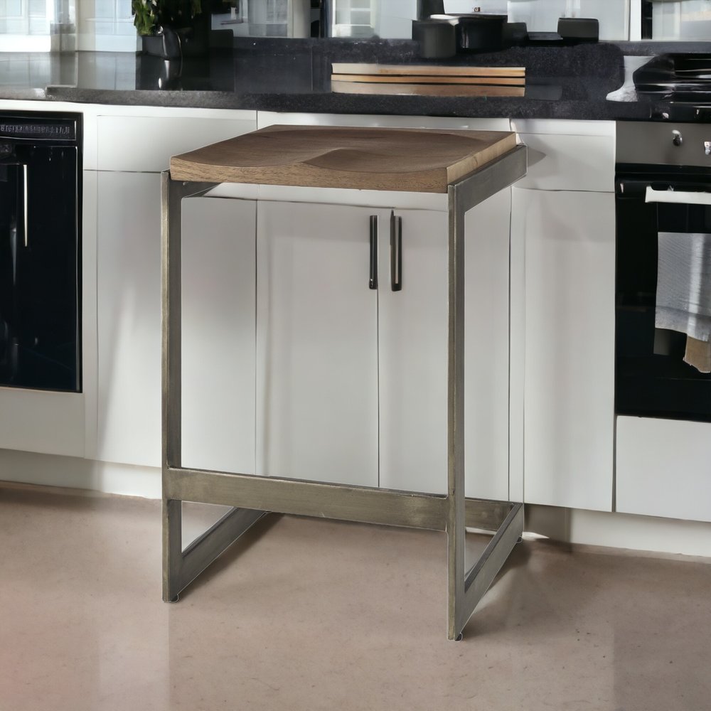 26" Wood Brown And Brown Solid Wood And Metal Backless Counter Height Bar Chair