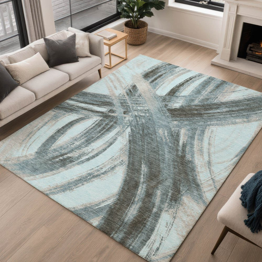 Add some artistry to your room with this 9-foot x 12-foot teal blue charcoal and silver abstract washable indoor outdoor area rug. This rectangle shaped rug features a abstract design that will work well both indoors or out. A classic shape marries with good looking design for your living room, hall, bedroom, porch, patio, or poolside. Ideal for outdoor spaces or high traffic areas with kids and pets, this rug is made from heavy duty polyester that is stain resistant to help repel water, dirt, and stains. Versatile in use, durable, and easy to maintain, this rug is an ideal solution to add a decorative and inviting touch to your indoor or outdoor space. 108.00-inch h x 144.00-inch w x 0.19-inch d.