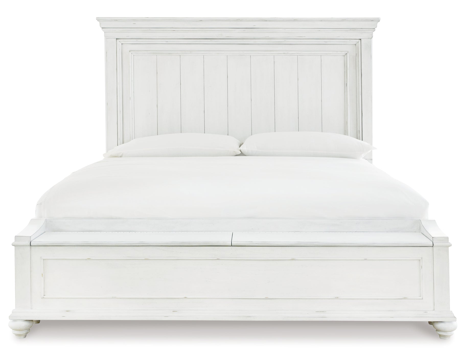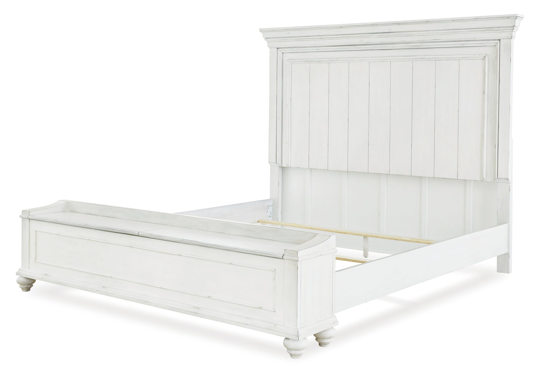 Give your retreat vintage charm with this queen upholstered panel bed. In a beautifully distressed whitewash finish, you'll love the headboard's grand style featuring an inset button tufted upholstery cushion. Generously scaled moulding from top to bottom, along with bun feet and nailhead trim give this bed character—evoking the feel of a quaint cottage escape.