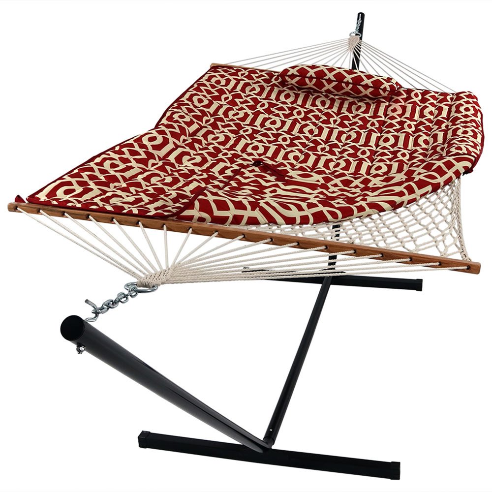 Experience ultimate relaxation with the red geometric spreader bar hammock hammock stand included. Designed in a traditional style, this hammock offers both comfort and elegance. The vibrant red color adds a pop of brightness to any outdoor space, perfect for lounging on sunny days. Equipped with a sturdy stand, it provides easy setup and stability, allowing you to enjoy your hammock wherever you choose. The spreader bar design ensures that you have ample space to stretch out fully while maintaining a stylish appearance. Transform your backyard or porch into a personal retreat with this charming and functional hammock, ideal for unwinding after a long day or enjoying lazy afternoons with a book. 48.00-inch h x 144.00-inch w x 52.00-inch d.
