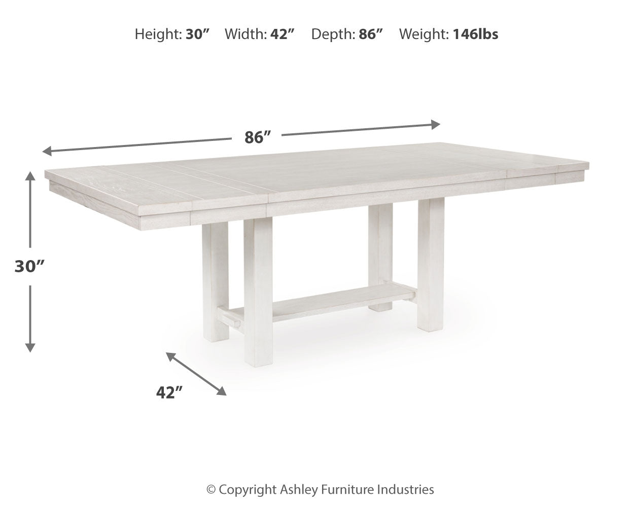 This counter height dining table brings an air of casual charm to mealtime. With its antiqued white finish, farmhouse-style dining has never been so fashionable. And this curated approach to everyday function is loaded with storage options, from cabinets to drawers to wine shelves. All that’s missing is you and your family.
