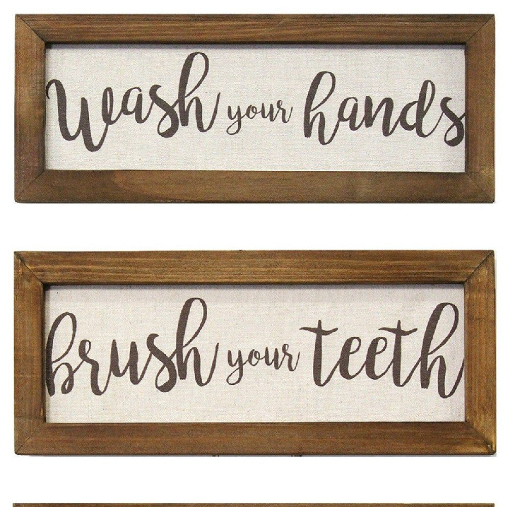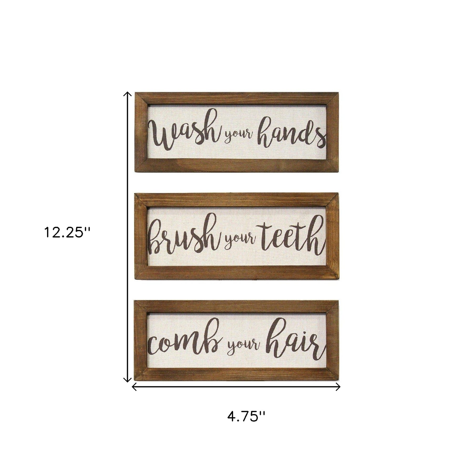 Dress up a plain bathroom wall with Set of 3 Printed Linen Bathroom Rules Wall Art. This handcrafted set features sayings we all grew up hearing, "Wash Your Hands," "Brush Your Teeth," and "Comb Your Hair" and serve not only as delightful wall decor but also as a kind reminder to all, especially little ones. Each is beautifully printed on linen with backer board and finished with a rich brown-stained wood frame. Display them together to create one large "check-off" list or hang them separately around the room for a gentle reminder at every turn. 4.75-inch H x 12.25-inch W x 0.5-inch D