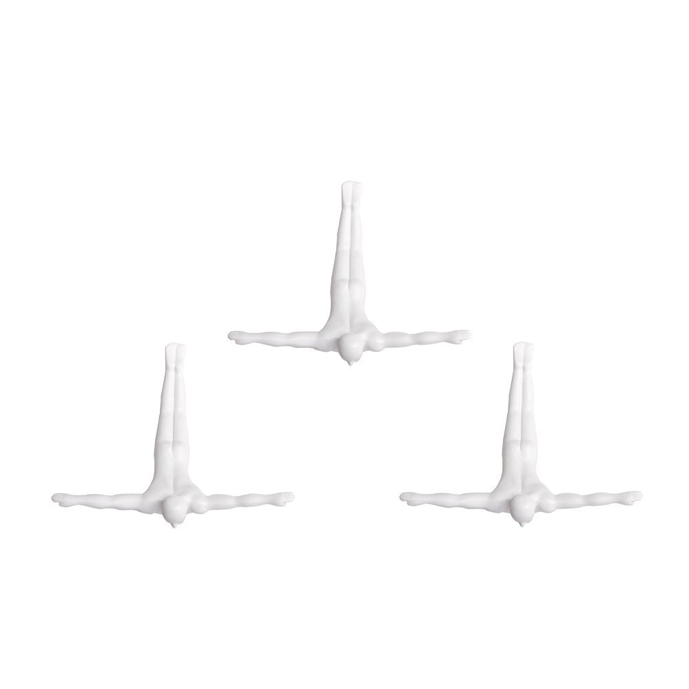 Instantly liven up your space with this art that brings color and dimension to your walls. Hang on your wall to add some up to date fashion and decoration. This super cool wall sculpture set creates the illusion of men diving from the surface from which they are hung. Made from durable resin, this striking 3D art creates an eye-catching and conversation starting decor. 6.5-inch h x 6.5-inch w x 2.5-inch d.