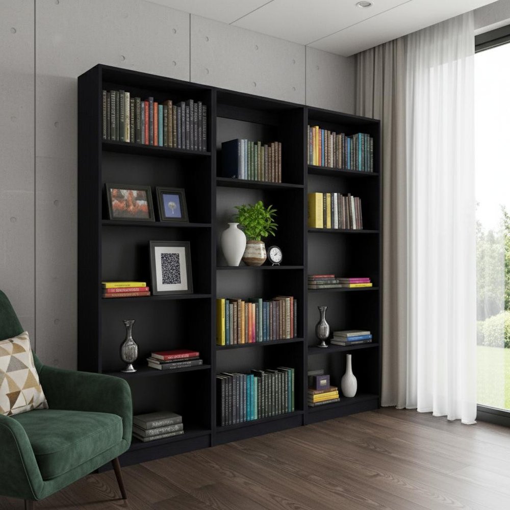 The set of three black wood four tier bookcases offers you storage and display space in a good looking and refined manor. 4 shelf tiers are available, providing great storage and display options for everything from books and photos to decorations. Utilize the three pieces together for split up as desired. This clean lines modern shelving unit is crafted from sturdy and durable manufactured wood. 71.1-inch h x 24.7-inch w x 11.7-inch d.